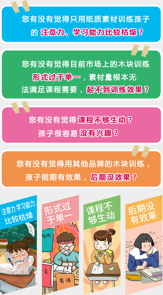 脑洞大开,开发时间历时18个月,数十位专业老师参与,上百次的讨论、修正、设计,奔波全国10余个省份,累计路程达十万公里以上。功夫不负有心人,我们取得了丰硕的研究成果。它是衡中学能的专利产品(专利号:2101930519370.X)。衡中学能教具课程包含60套教具盒、60本阶级配套图卡、教具版课程生成系统、教具版注意力测评系统。脑洞大开是一款高效训练,注意力+专注力的情景式训练教具,达到视听,视动,听动的训练方式,此外还特别增加了孩子的行为认识训练以及行为规范悬链,每一节课都以情景式故事演绎来进行,有效提高孩子的兴趣,达到持续训练的目的。