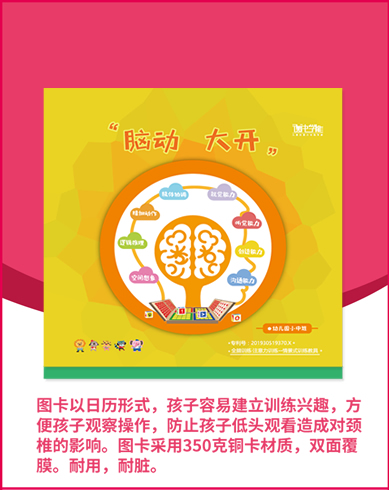 图卡以日历形式,孩子容易建立训练兴趣,方便孩子观察操作,防止孩子低头观看造成对颈椎的影响。图卡采用350克铜卡材质,双面覆膜。耐用,耐脏。